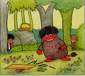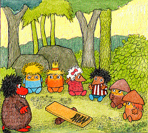 "Hi, everybody", Bugbear greeted his friends. "I'm so excited!" said Sumppi boy, Timmy. "Me, too" said his sister, Linnie. "I don't remember how to play this", said one of the Mushroom kids. "I remember everything!" said Noppa girl. "Don't worry", said Bugbear. "First we choose the person who will scatter the sticks. Eenie meenie, minie, moe..." |